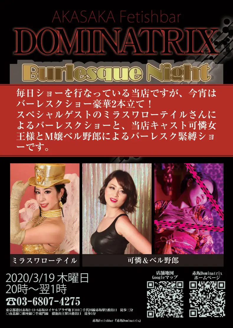 春先取り 華やかに赤坂Dominatriイベント 《Burlesque Night》 バーレスクを豪華二本立て スペシャルゲストは、ミラ・スワローテイルさん 赤坂Dominatrixからは 可憐女王様 M女 ベルさん