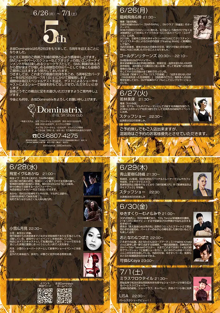 御贔屓にしてくださっている常連様方はもちろん、お初めてのお客様にはこの煌びやかで刺激的なSM世界に初めて触れる絶好の機会となることでしょう。