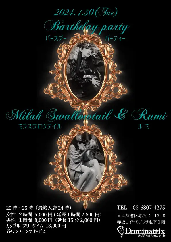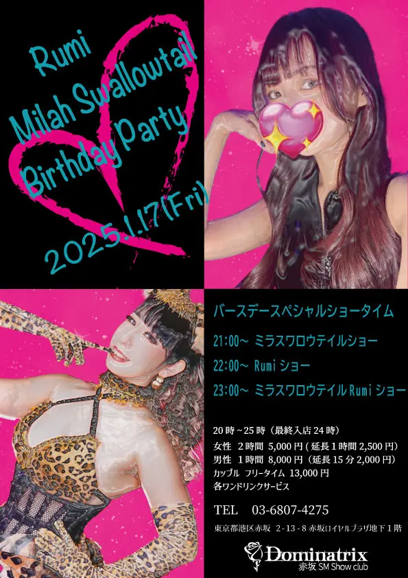 1/17(金)は大人気嬢Rumiとバーレスクダンサーミラスワロウテイルのバースデーパーティー!